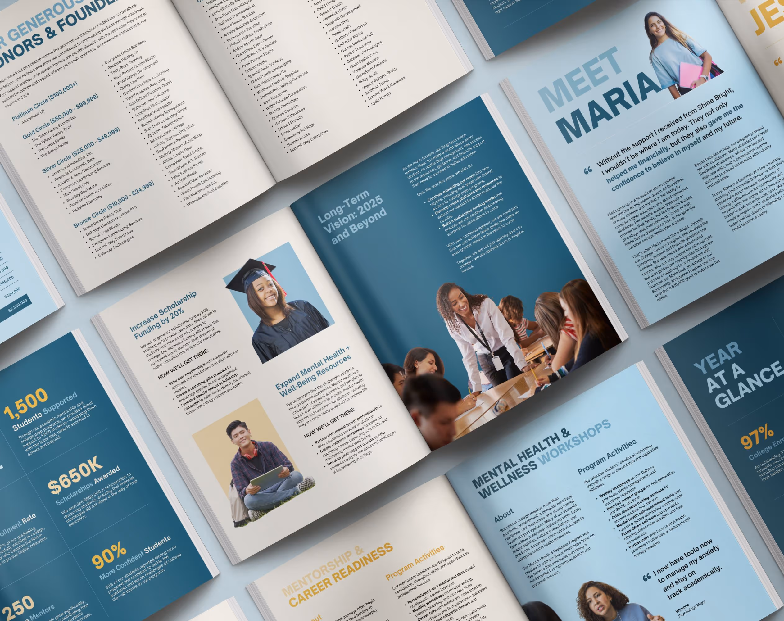 Since 2019 we've partnered with 60+ nonprofits and foundations—designing annual reports and storytelling tools that help supporters understand your work, feel compelled to support it, and keep coming back.