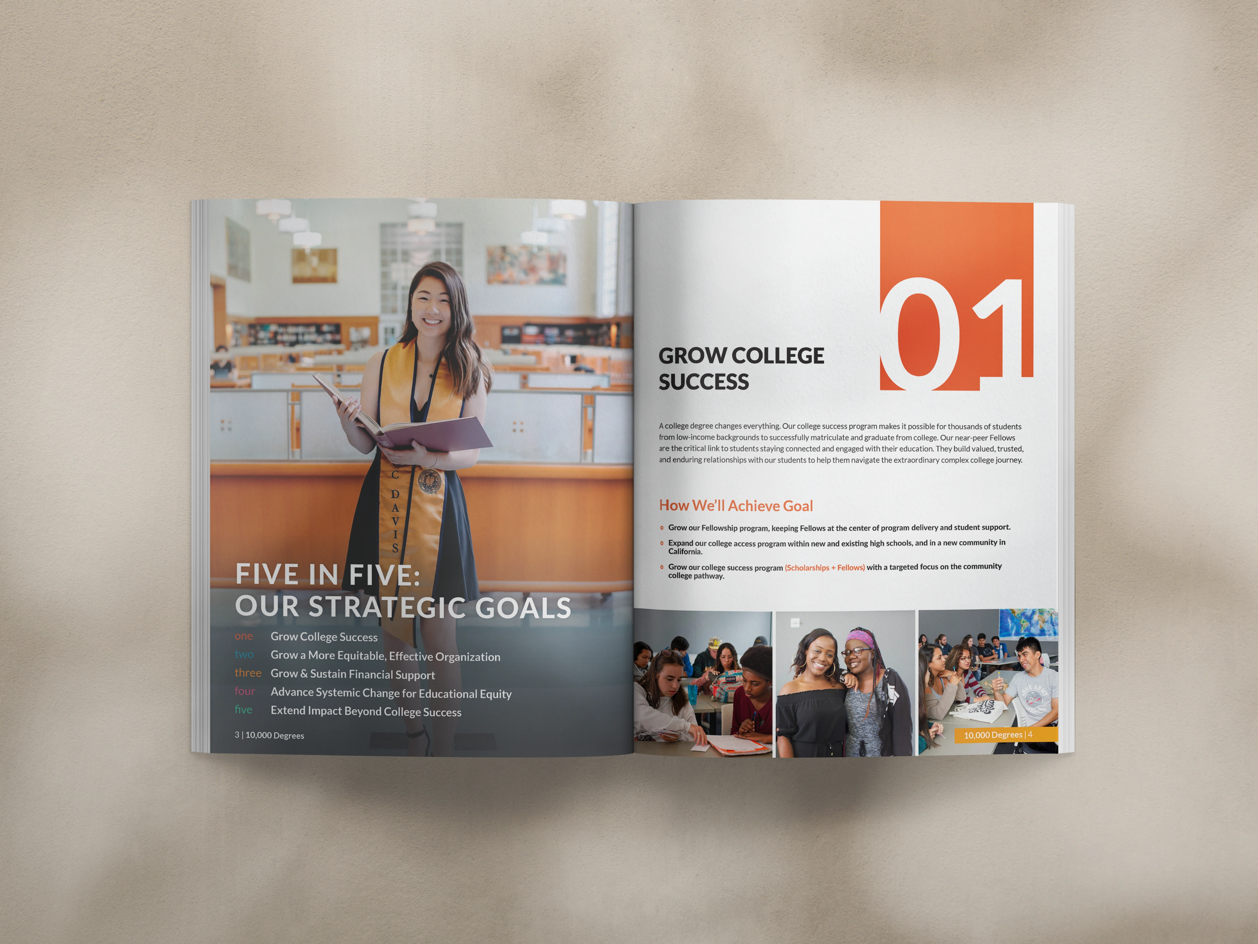 The impact report combined student photography, bold color, and hand-drawn iconography to capture the organization’s spirit while maintaining clean hierarchy and readability. The strategic plan used a more restrained, minimalist system to foreground long-term goals and institutional credibility.