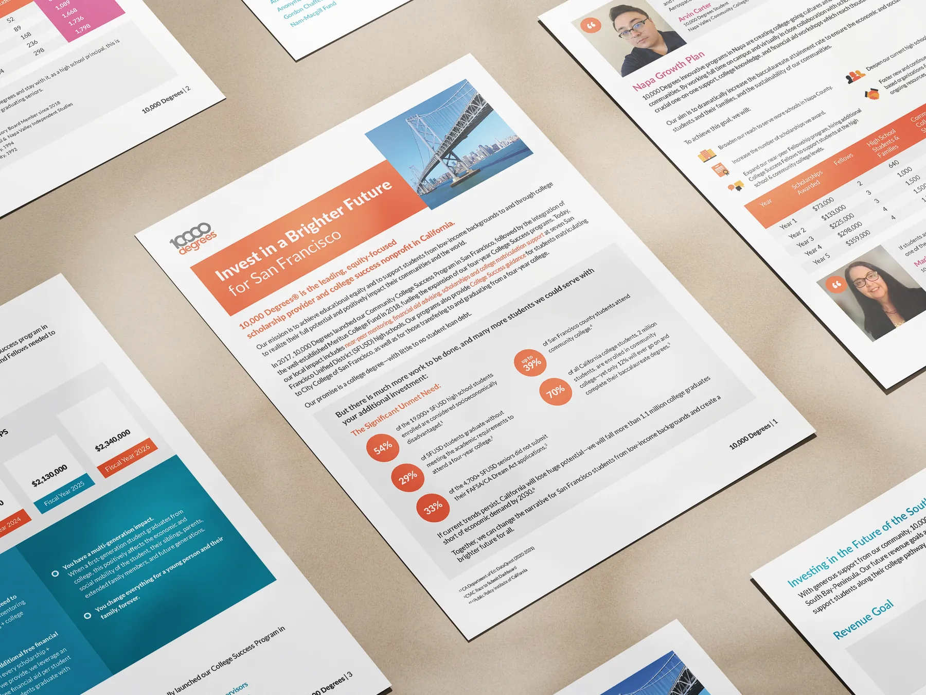 10,000 Degrees helps students from low-income backgrounds pursue higher education through scholarships, mentorship, and long-term support. Their communications needed to reflect both the energy of their student community and the credibility required to engage institutional donors and partners.
