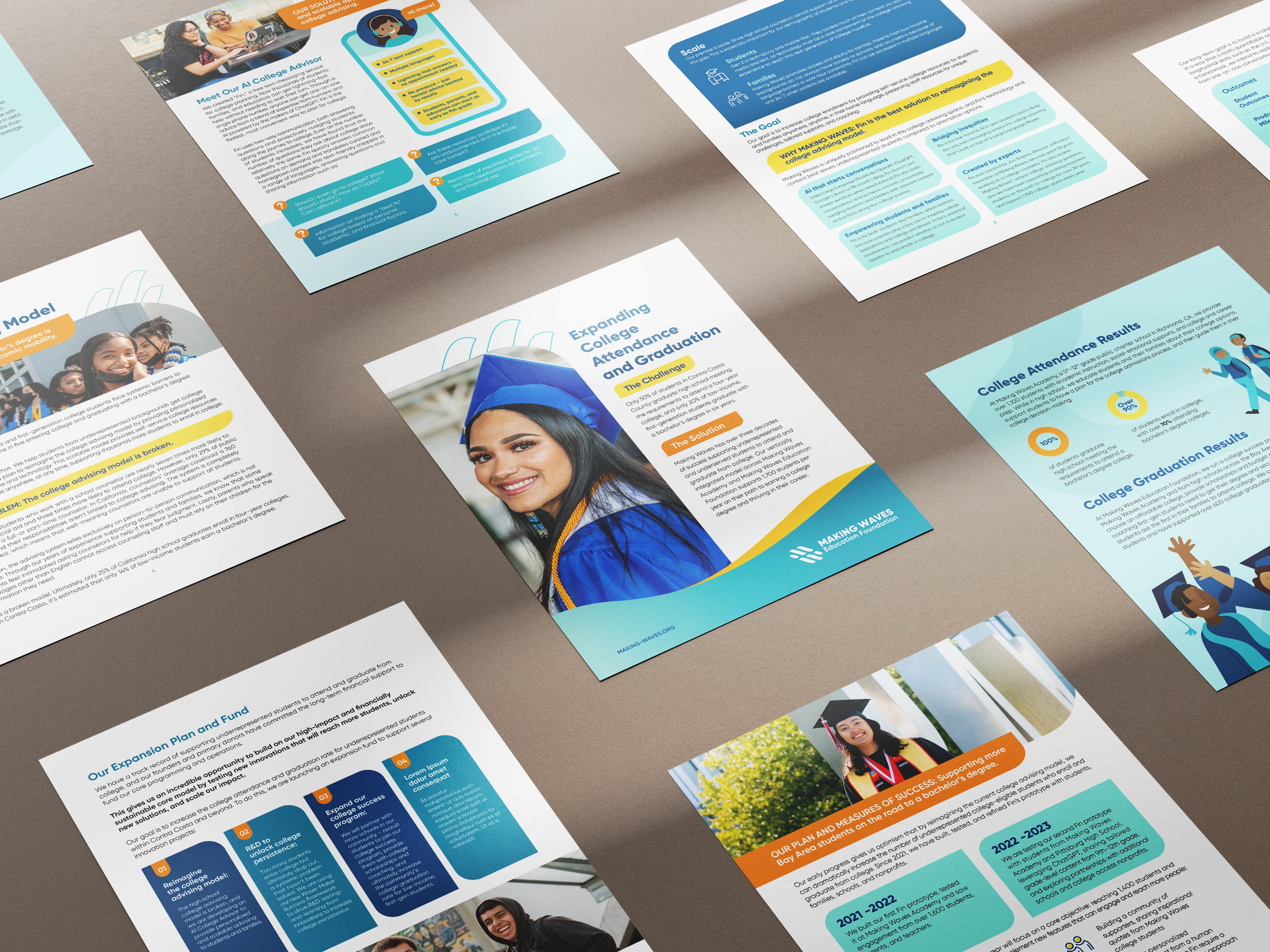 With programs spanning both the Foundation and the Academy, the organization needed design support that could extend across reports, fundraising campaigns, campus environments, and digital communications.