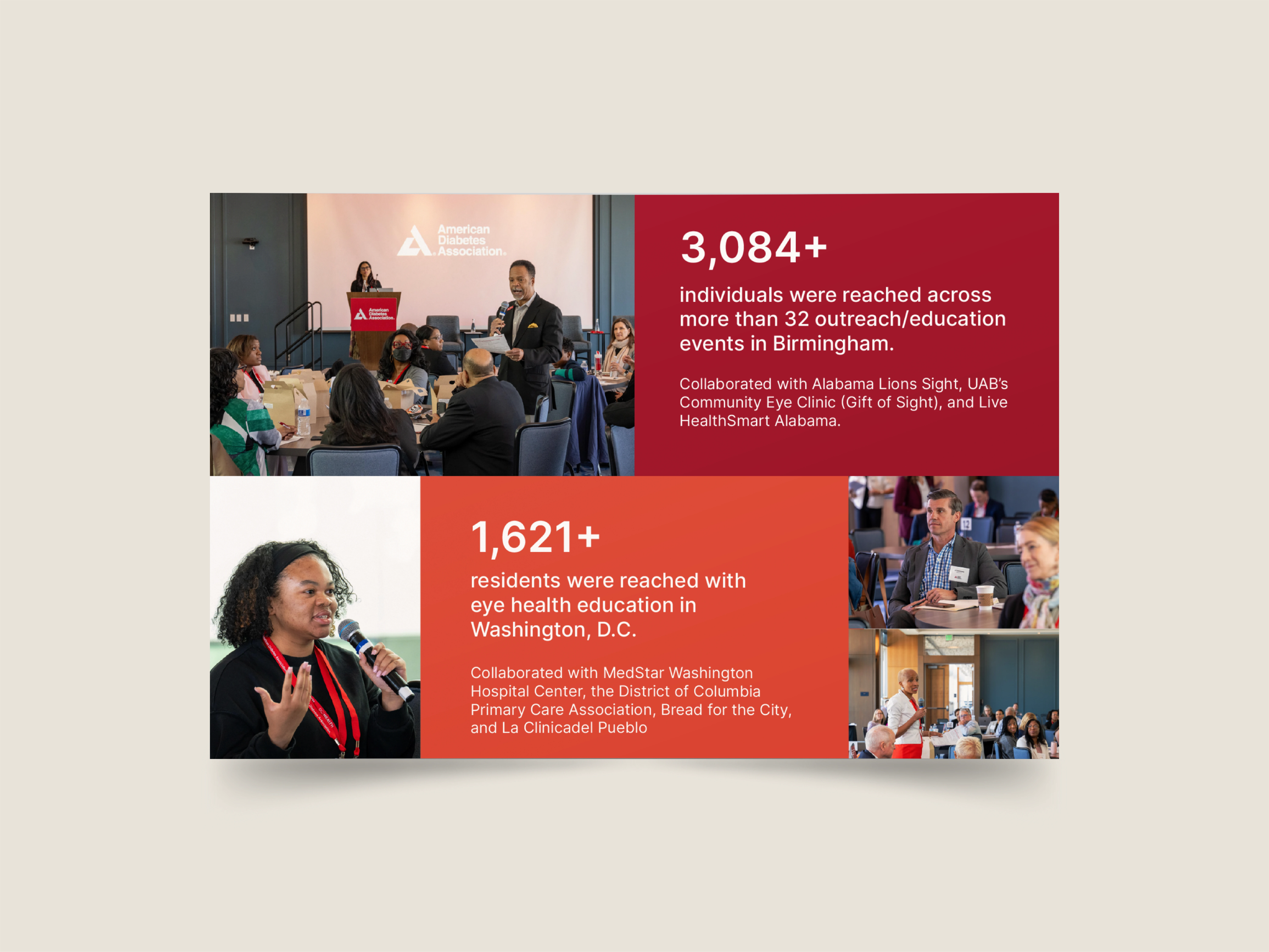 Together, these pieces formed a cohesive, visually engaging package that demonstrated measurable impact and reinforced ADA’s position as a national leader in advancing equitable access to eye care.